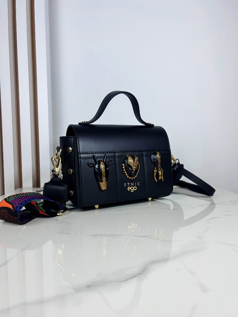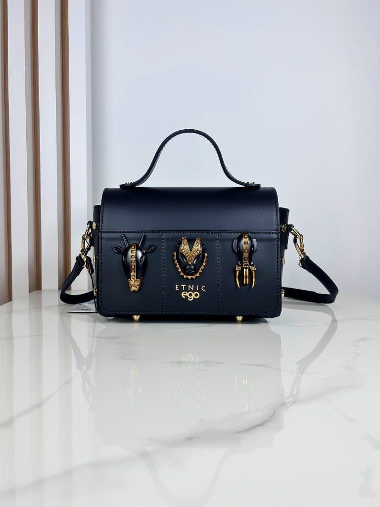 Ego skórzana torebka kuferek z głowami zwierząt czarna