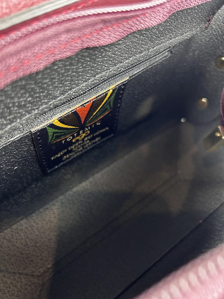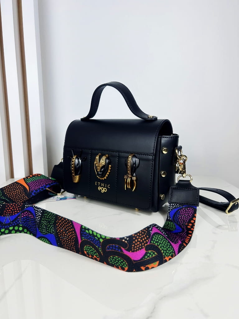 Przód klapki zdobią czarno złote wizerunki zwierząt, które są wyrazistym znakiem rozpoznawczym tego modelu oraz złote logo marki w postaci napisu, które nadają jej wyjątkowego charakteru. Wnętrze torebki składa się z jednej głównej komory zamykanej na zamek, z dodatkową kieszonką na drobiazgi, co ułatwia organizację.