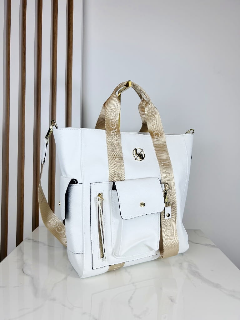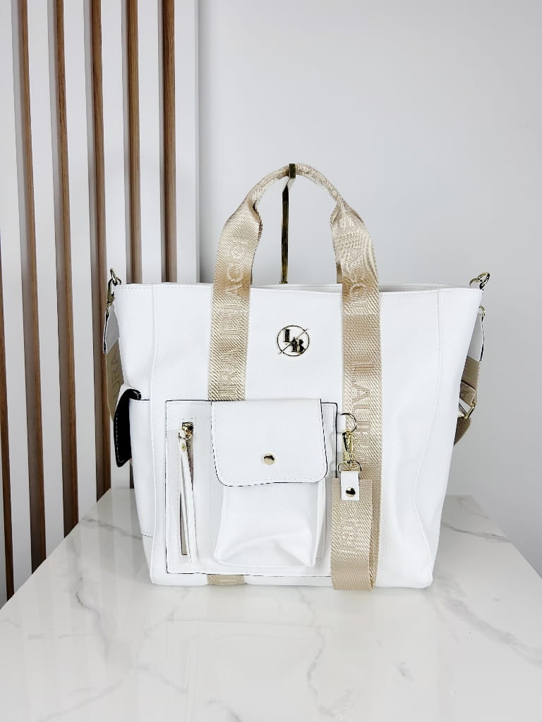 Laura Biaggi Torebka Shopper Biała z Kieszonkami to elegancka i funkcjonalna torba stworzona dla kobiet ceniących styl i wygodę. Wykonana z wysokiej jakości ekologicznej skóry, łączy modny design z praktycznym wnętrzem. Złote, biżuteryjne logo marki na przodzie nadaje jej ekskluzywnego charakteru. Torebka posiada cztery ozdobne kieszonki, w tym pionową kieszeń z dużą zawieszką, kieszeń na suwak oraz dwie kieszonki na zatrzaski, które dodają jej niepowtarzalnego uroku.