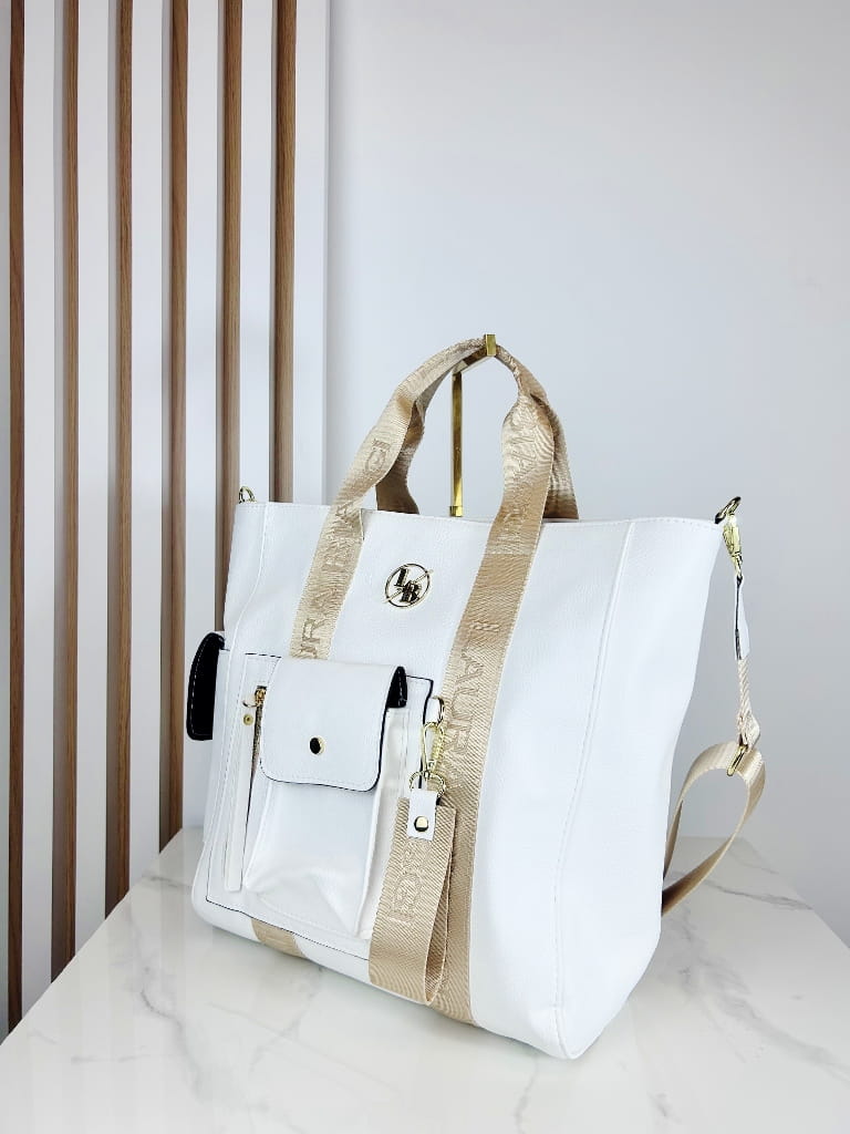 Torebkę można nosić zarówno w dłoni, dzięki wygodnym rączkom, jak i na szerokim logowanym pasku, który umożliwia komfortowe noszenie na ramieniu. Uniwersalna biel sprawia, że shopperka pasuje do każdej stylizacji, dodając jej lekkości i elegancji.
