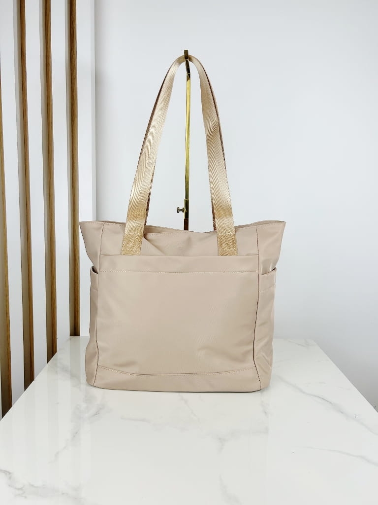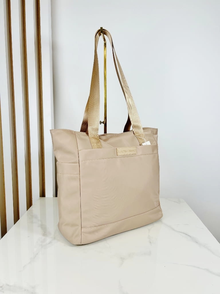 Beżowa shopperka wykonana z solidnego, syntetycznego materiału to must-have w garderobie każdej kobiety ceniącej wygodę i ponadczasowy design.